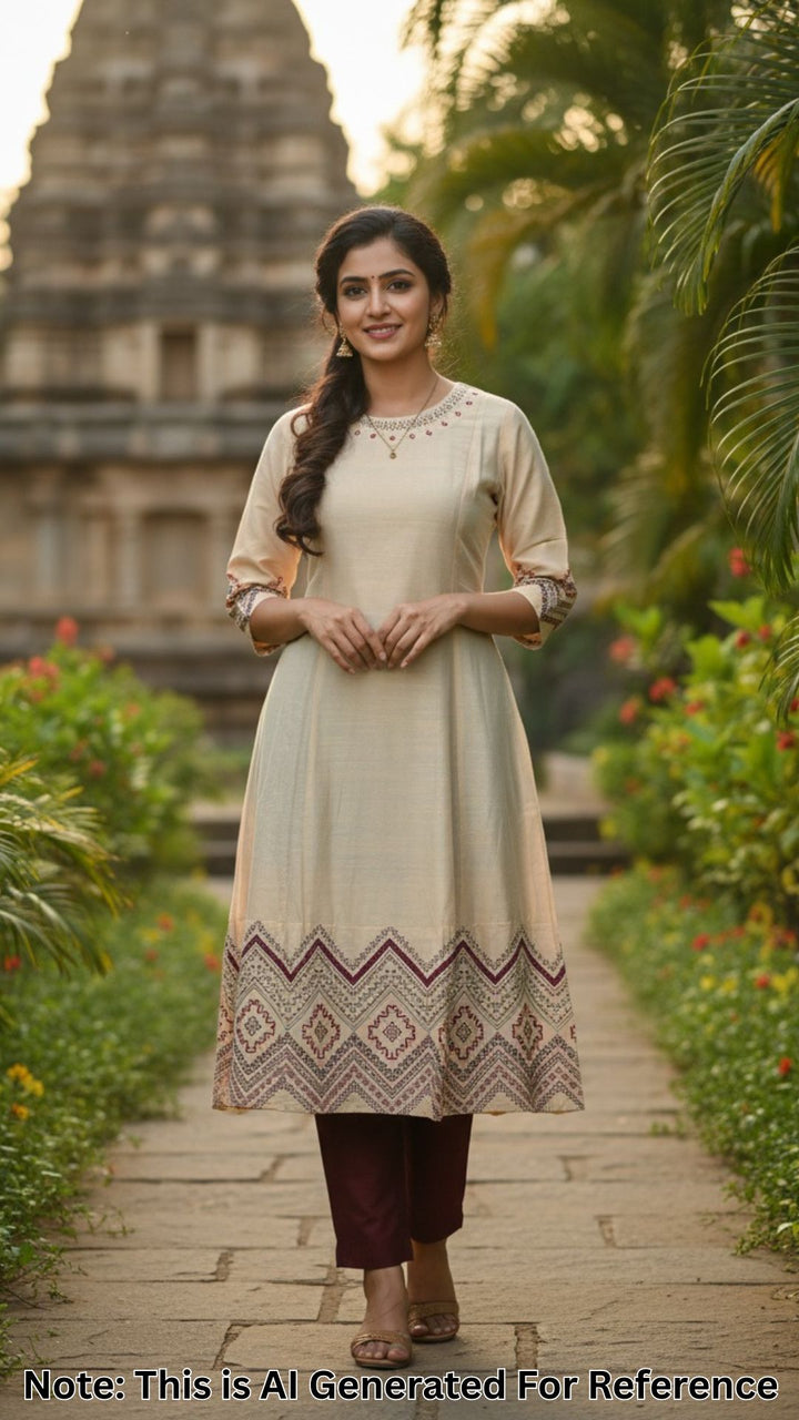Elegant Beige & Raw Silk Anarkali with geometric print and mirror work. Top length 46 inches, perfect for festive and ethnic occasions.