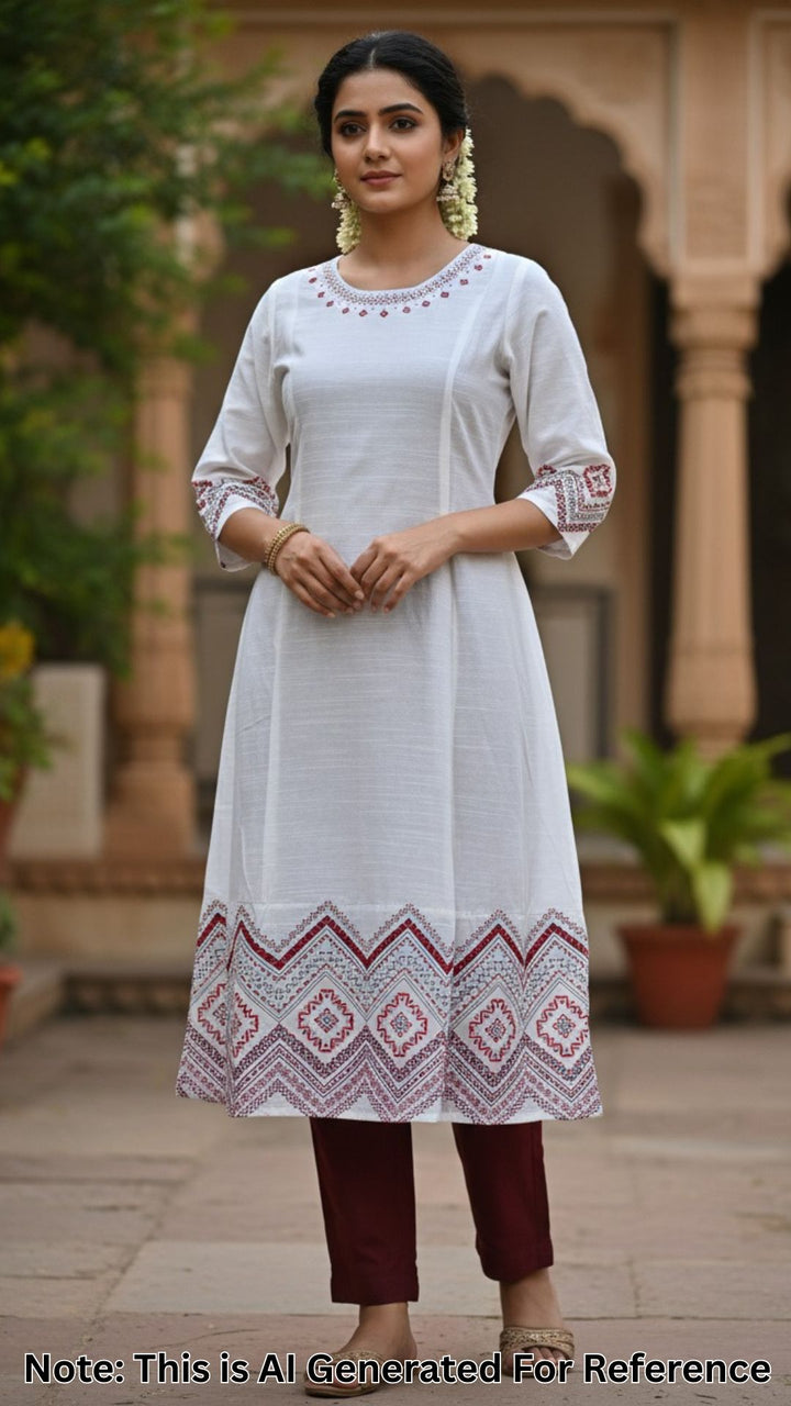 Elegant white & raw silk Anarkali with geometric print and mirror work. Features 46" top length and 16" sleeves. Perfect for festive and ethnic occasions.