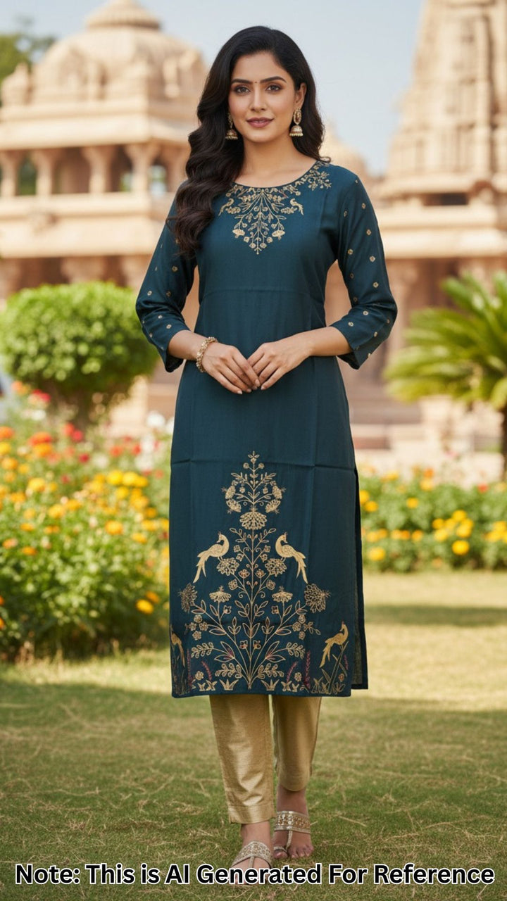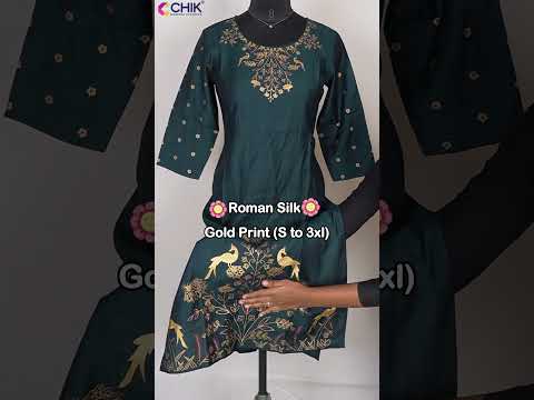 CK-06 Bottle Green Colour & Roman Silk Fabric Straight Cut Fit With Peacock Gold Print Top Length-44 Inch,Sleeve Length-16 Inch.