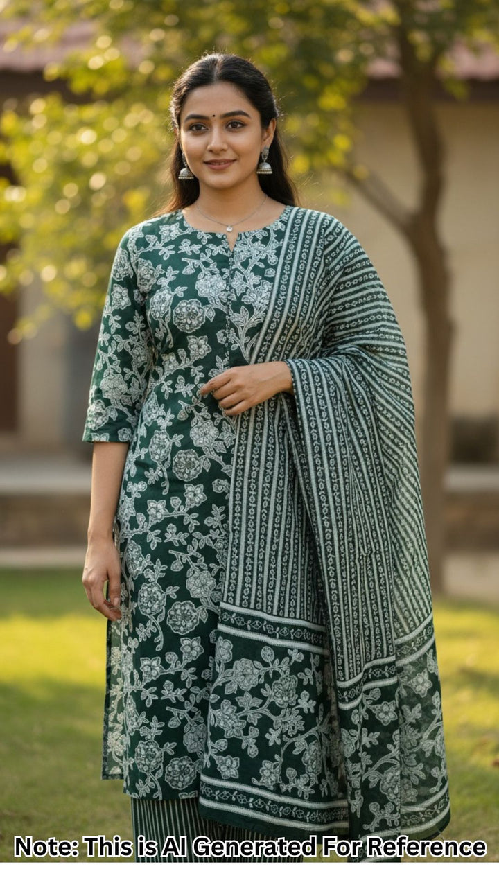 Bottle green cotton straight-cut kurta set with dupatta, featuring a 44" top length and 16" sleeves – a perfect blend of comfort, style, and tradition.
