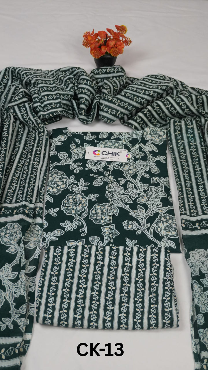 CK-13 Bottle Green Colour & Cotton Fabric Straight Cut Kurta Set With Dupatta Top Length-44 Inch, Sleeve Length-16 Inch.