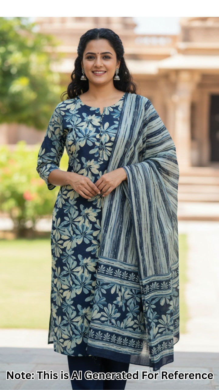 Navy blue cotton straight-cut kurta set with dupatta, featuring a 44" top length and 16" sleeves – a perfect blend of comfort, style, and tradition.
