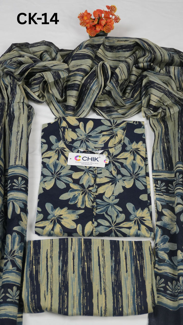 CK-14 Navy Blue Colour Cotton Fabric Straight Cut Kurta Set With Dupatta & Neck Piping With Fabric Buttons Work Top Length-44 Inch, Sleeve Length-16 Inch.