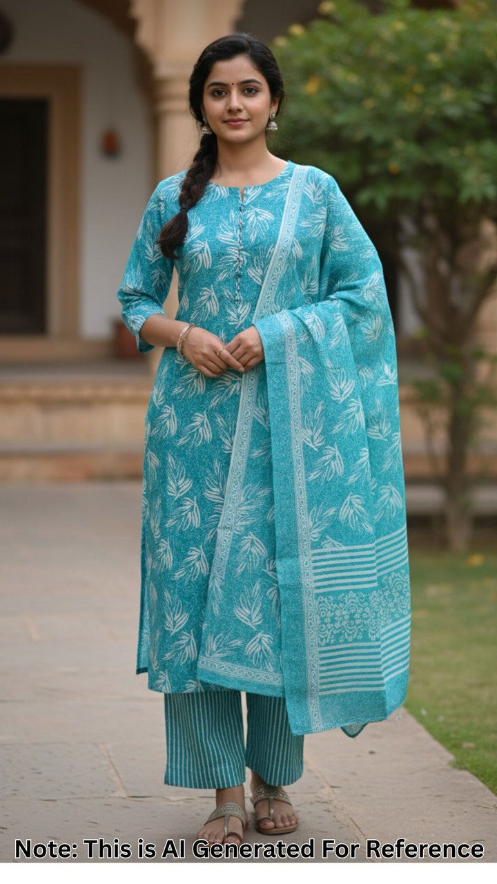 Light teal green colour cotton straight-cut kurta set with dupatta, featuring a 44" top length and 16" sleeves – a perfect blend of comfort, style, and tradition.