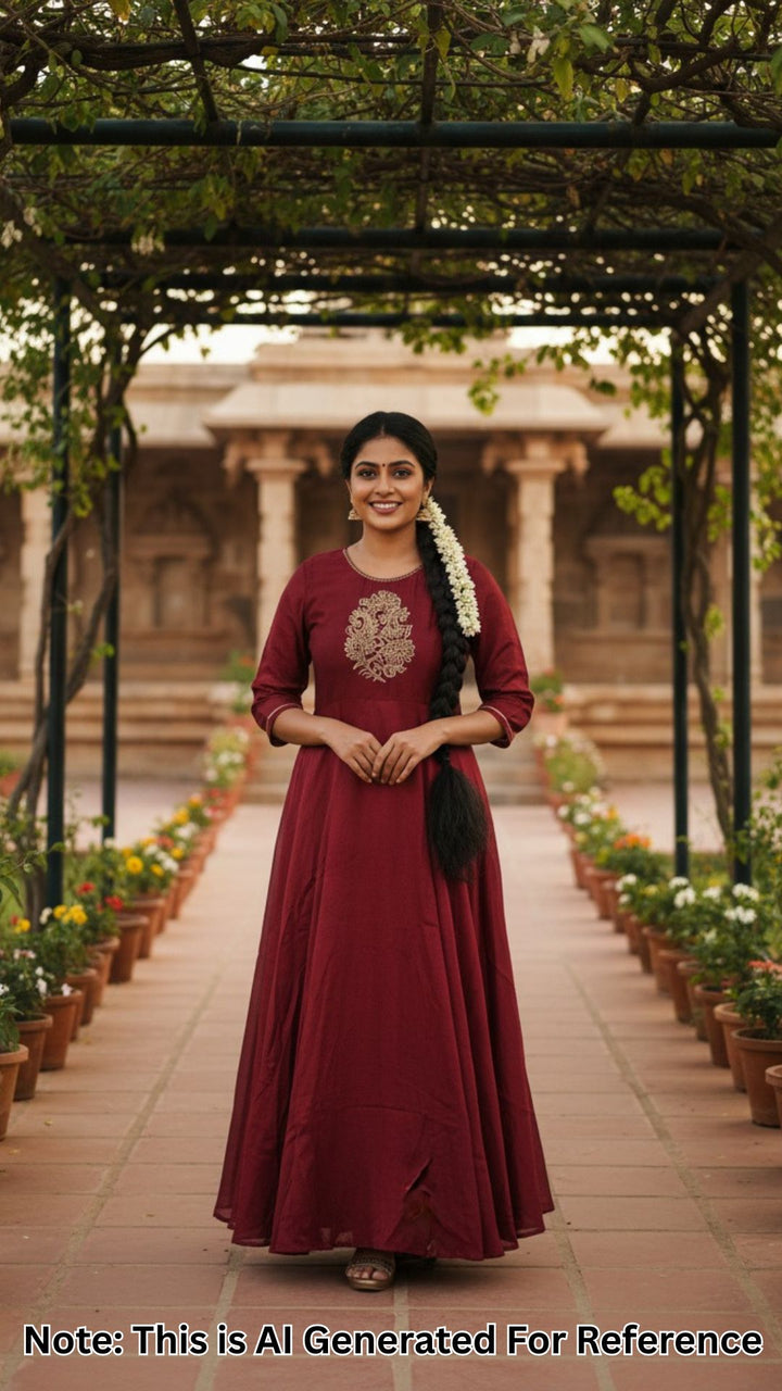 Maroon Vichitra georgette full flare Anarkali with paisley embroidery, gold zari work, and lining. Top length 52", sleeve length 16" – elegant and graceful.