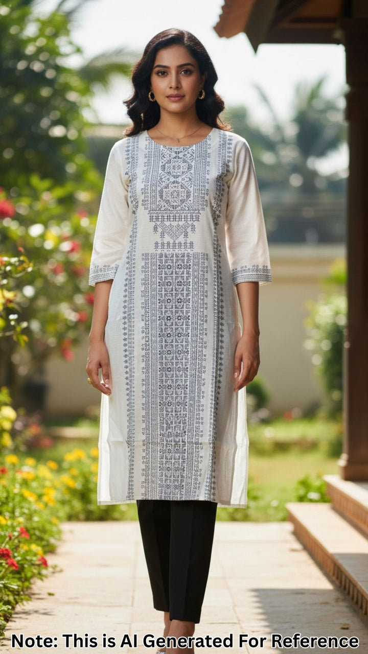 White Roman silk straight-cut kurta featuring a chic geometric print. Top length 44", sleeve length 16" – a stylish pick for everyday elegance.