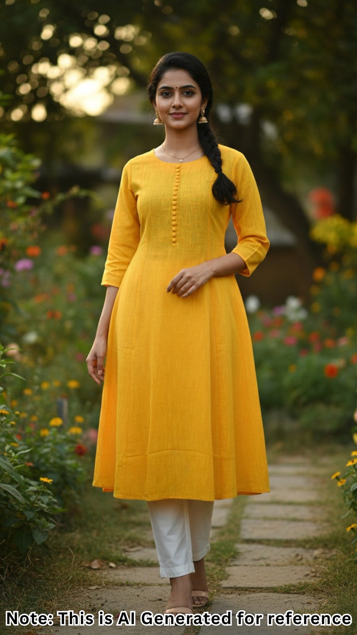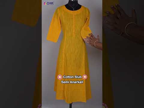 Mango yellow two-tone cotton Anarkali with stylish fabric button detailing. Top length 46", sleeve length 16" – perfect blend of comfort and contemporary style.