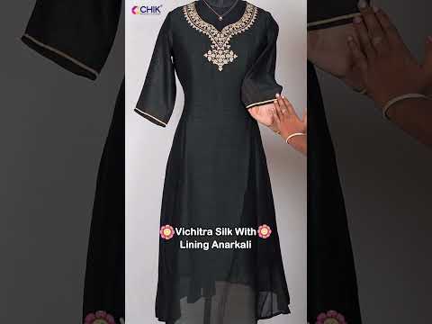 Dark olive green Vichitra georgette Anarkali with floral embroidery and gold zari work, lined for comfort. Top length 46", sleeve length 16" – elegant and graceful fit.