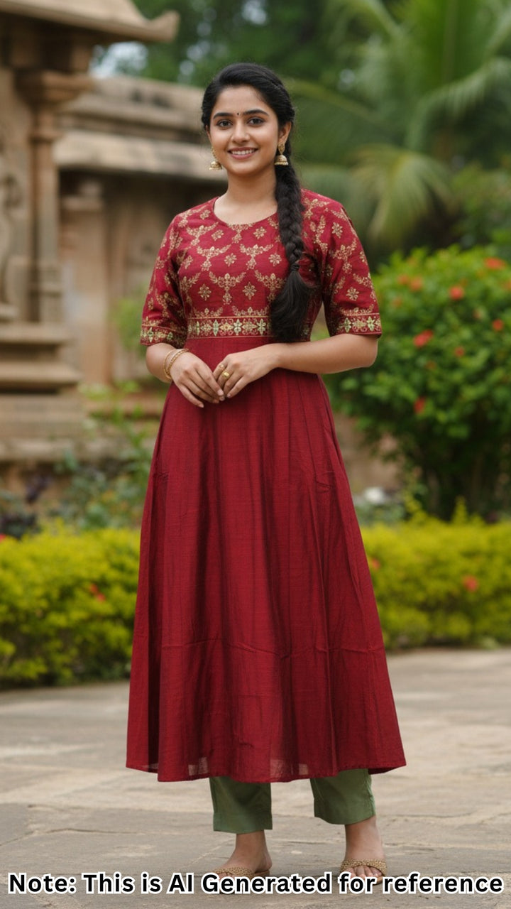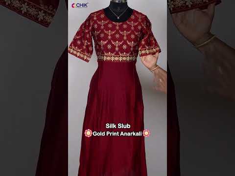 CK-48 Maroon Colour Raw Silk Fabric Anarkali Fit & Floral Gold Print Top Length-46 Inch Sleeve Length-16 Inch