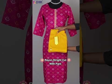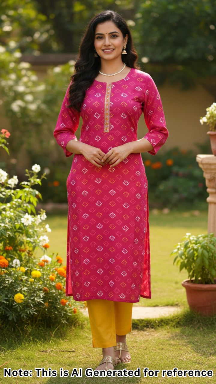 Pink rayon printed straight-cut kurta with mango yellow pants and geometric embroidery. Top length 44", sleeve length 16" – vibrant, stylish, and perfect for any occasion.