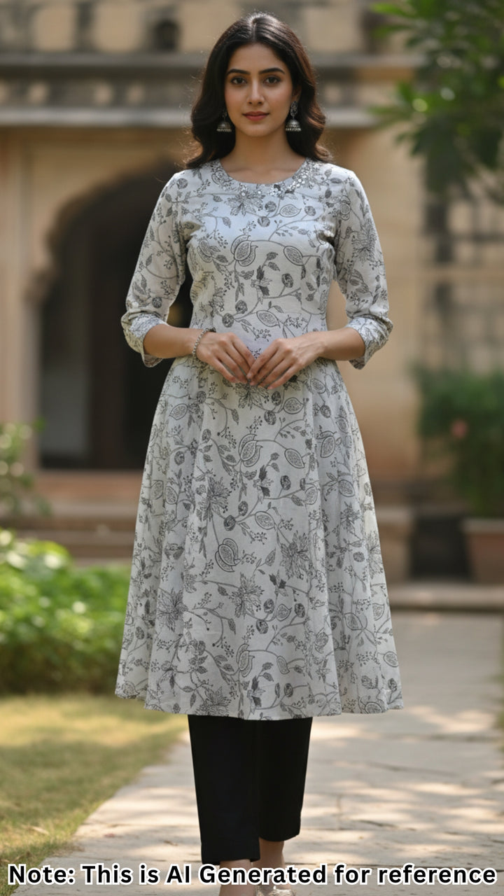 Light gray rayon Anarkali with all-over print & mirror work. Elegant 46” top with 16” sleeves, perfect blend of comfort, style & tradition."