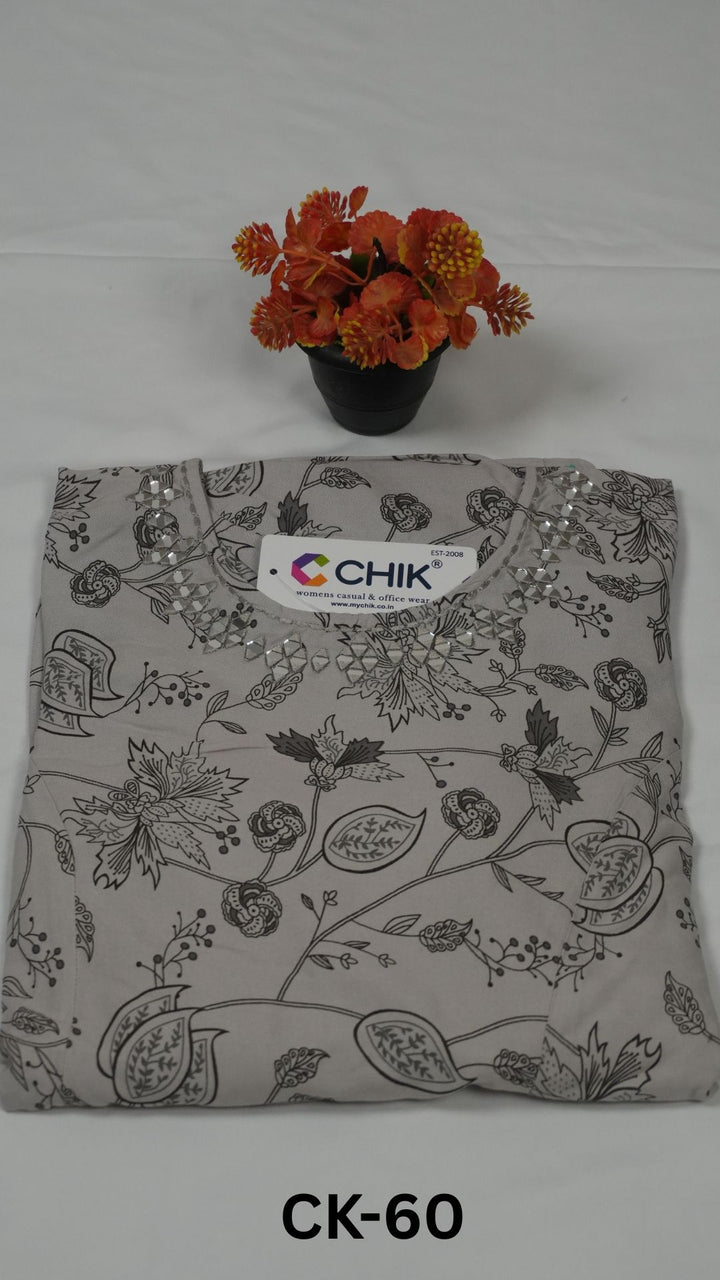 CK-60 Light Gray Colour Rayon All Over Printed Fabric Anarkali Fit & Mirror Work Top Length-46 Inch Sleeve Length-16Inch