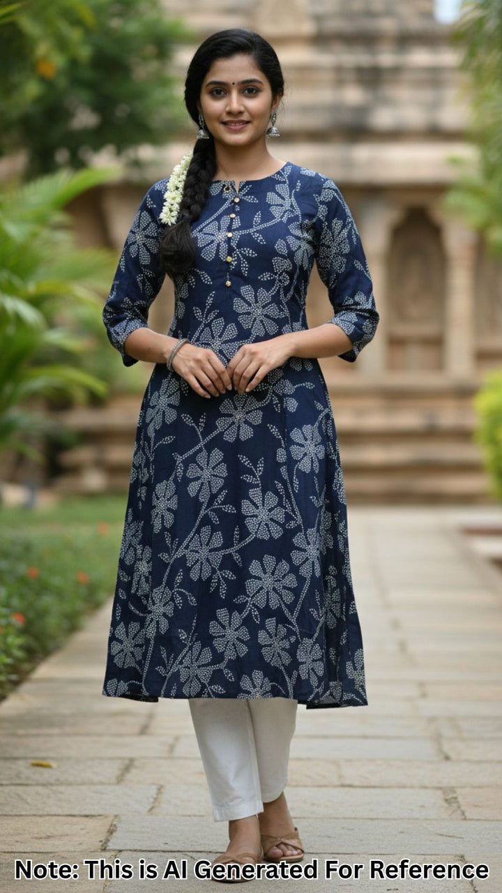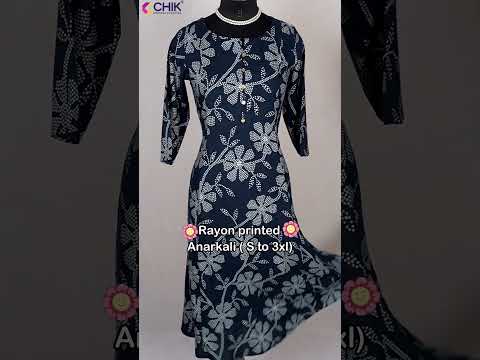Navy blue green rayon Anarkali with all-over print and gold button detailing. Top length 46", sleeve length 16" – a stylish and graceful pick for any occasion.