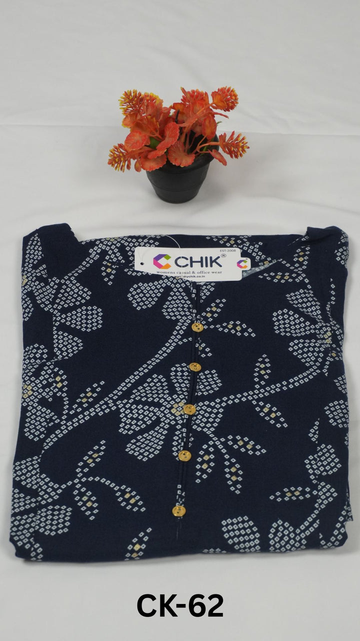 CK-62 Navy Blue Colour Rayon All Over Printed Fabric Anarkali Fit & Gold Buttons Work Top Length-46 Inch Sleeve Length-16 Inch