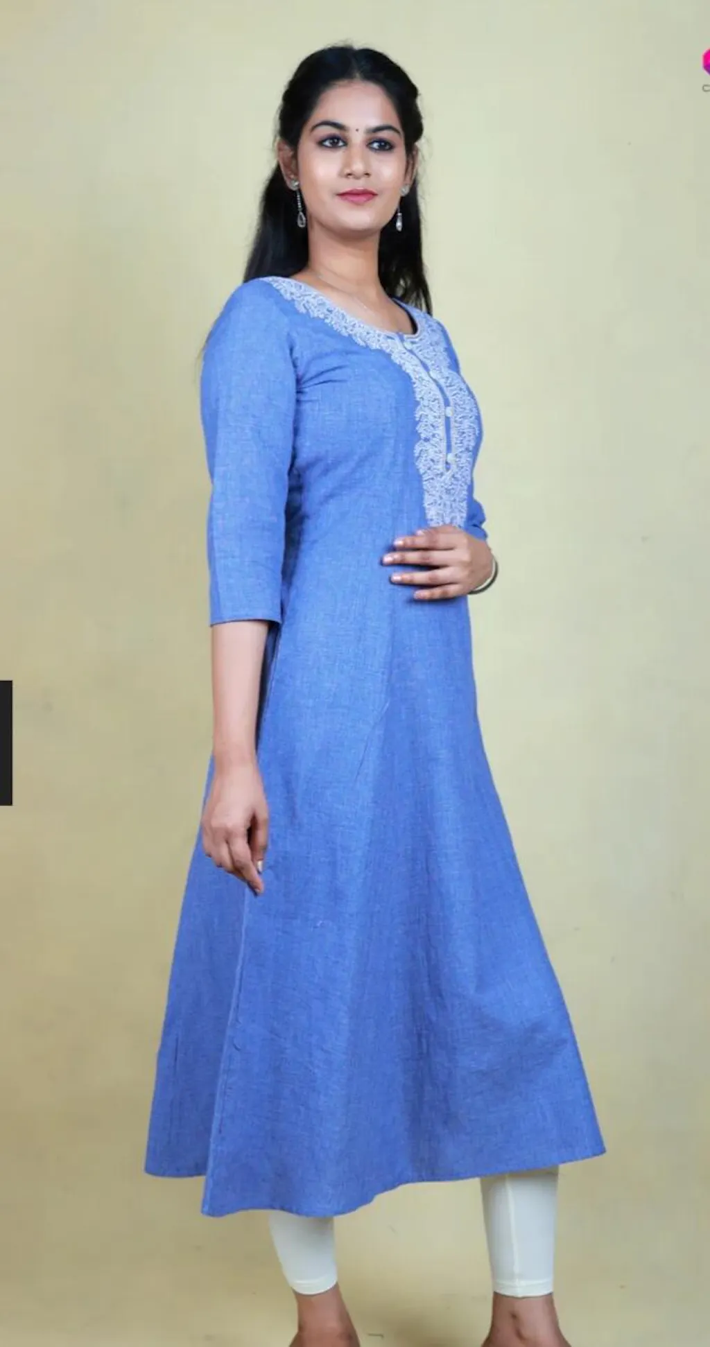 "Charming lavender south cotton Anarkali with classic yoke embroidery and button detailing, 46” length and 16” sleeves. Elegant ethnic daily wear."