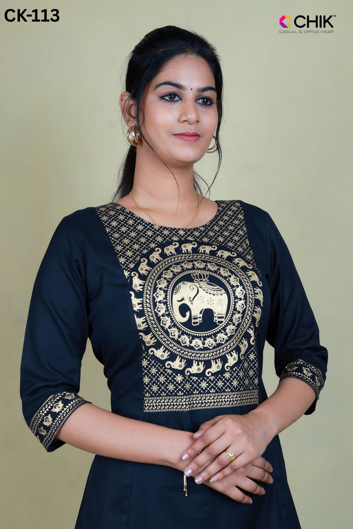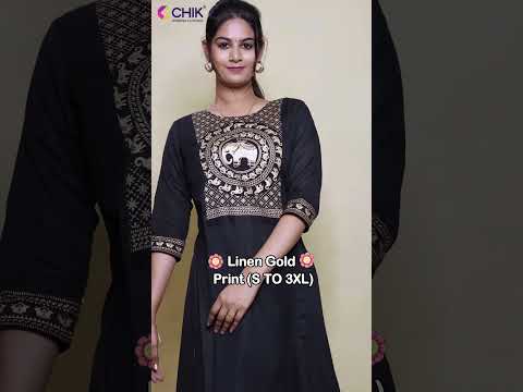 CK-113 BLACK COLOUR LINEN FABRIC ANARKALI FIT & PLACEMENT GOLD PRINT TOP LENGTH-46' SLEEVE-16'.