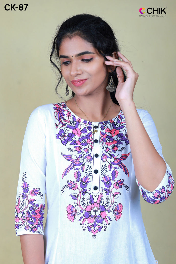 CK-87 White Colour Linen Cotton Fabric Anarkali Fit & Placement Floral Print Top Length-46 , Sleeve-16.